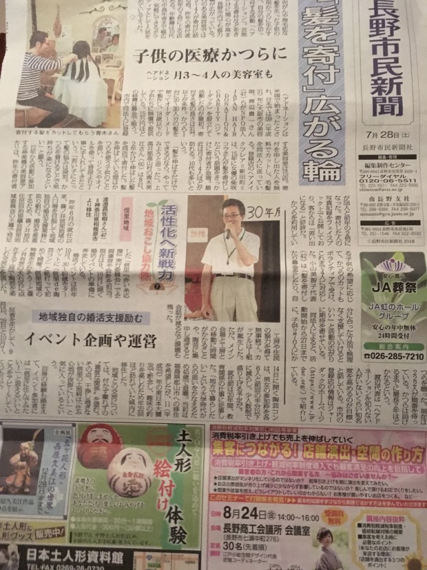 2018 7/28号長野市民新聞 佐藤さまに 取材に来ていただき、NPO法人JHD&Cさんへの毛髪の寄付、スタイルカットのお話をさせていただきました。 長い髪を切った方を見て 寄付したのかなぁと すぐ浮かぶ世の中に だいぶ近くなっていると思います。... -