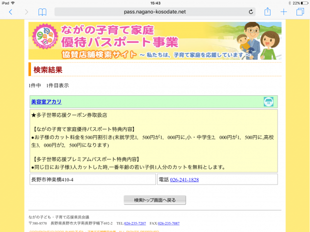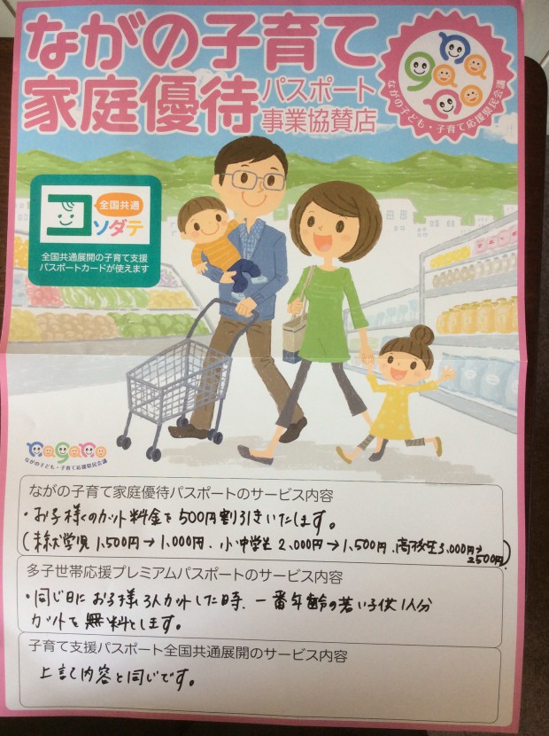 ながの子育て家庭優待パスポート事業が 平成28年4月から全国展開になります。他県にお住まいで 各自治体のパスポートをお持ちの方も 美容室アカリでは同じサービス内容となります。里帰りの時など お使いください。 美容室アカリ長野市神楽橋41... -