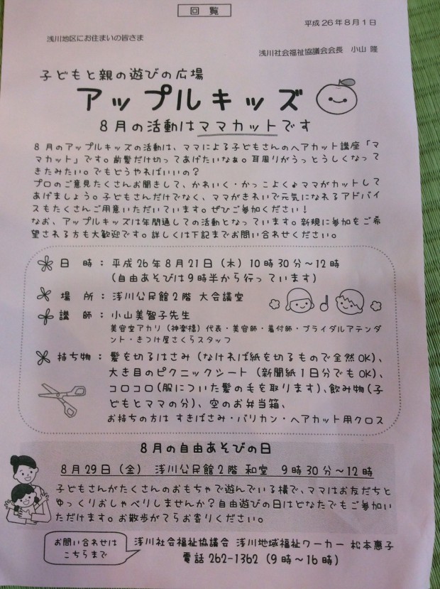 2014年8月21日美容室アカリ設立日が2009年8月22日なんです!5年目の最終日にとても良いご依頼をいただき、ありがとうございました浅川地区の未就園児とお母さんのサークル、アップルキッズにて、ママカットの講師として行ってまいりました♥️19... -